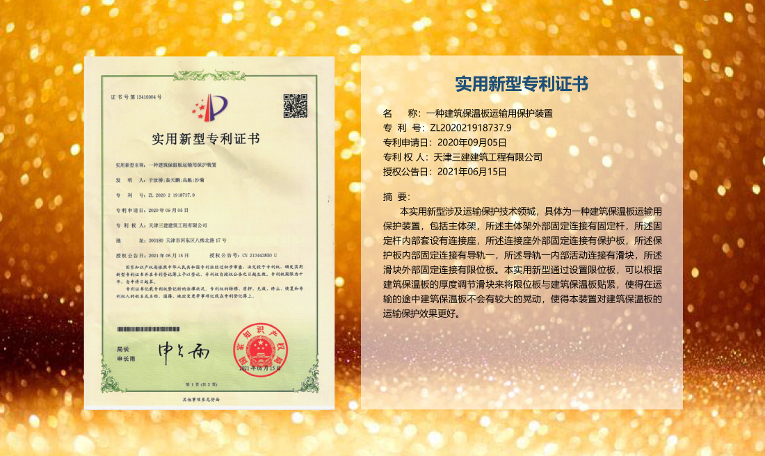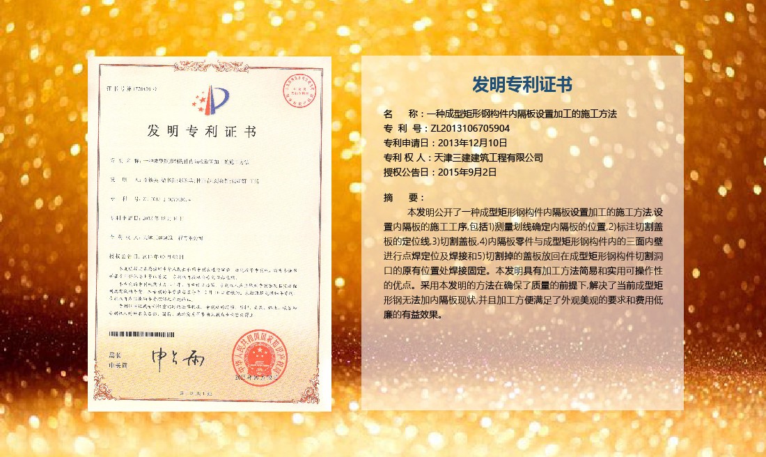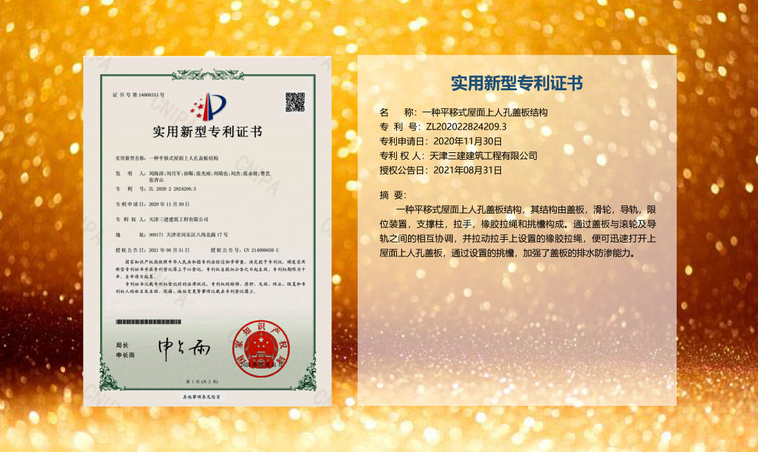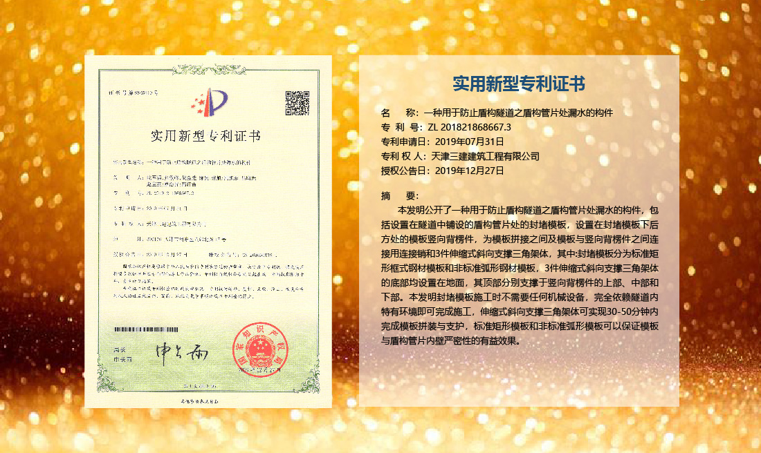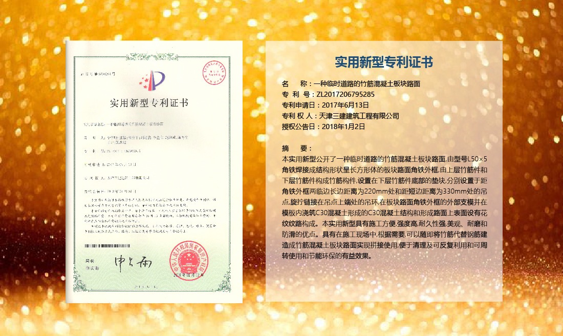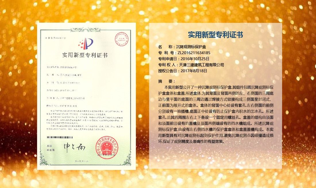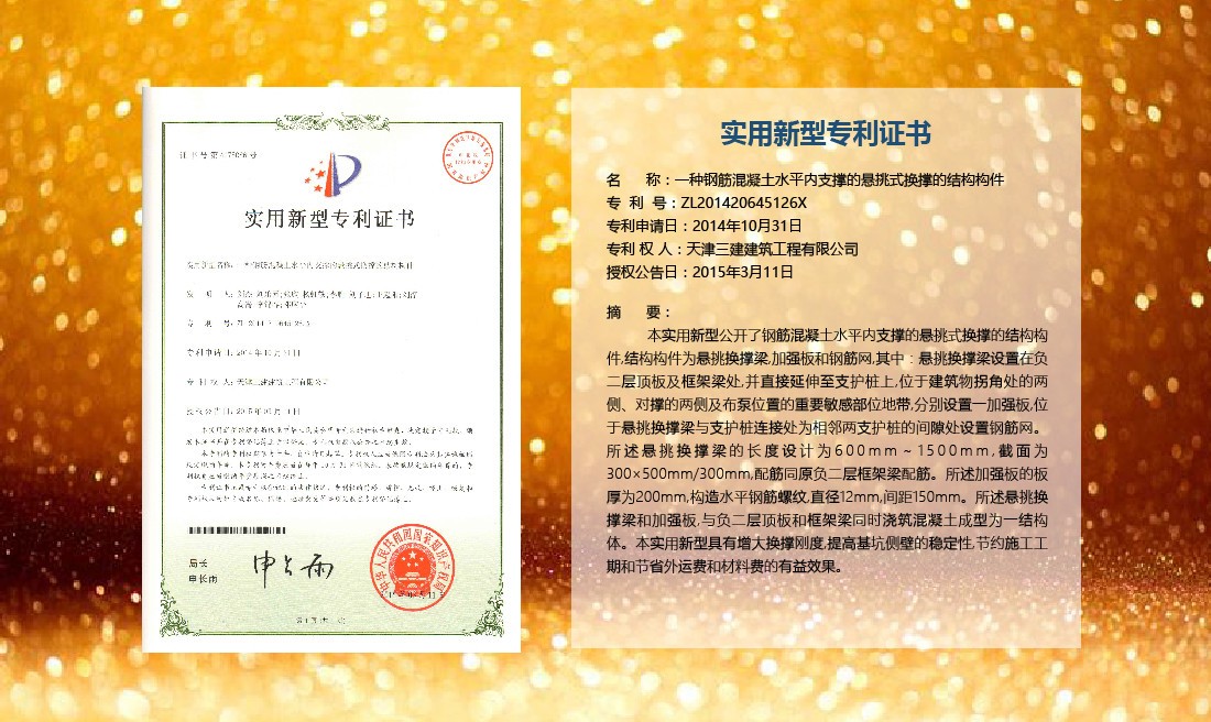 三建公司在總結施工經驗的基礎上,不斷發明創新,共獲得國家知識產權局授權專利71項,其中,國家發明專利12項,國家實用新型專利59項。囊括建筑、市政、巖土、道橋等多領域,凝聚了公司廣大工作人員的寶貴智慧和工程建筑者們的辛勤汗水。