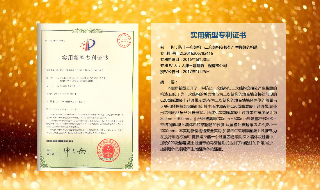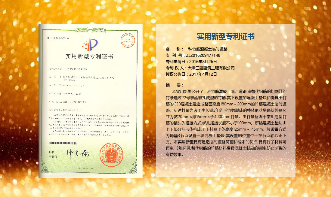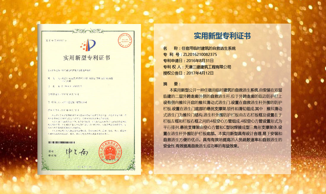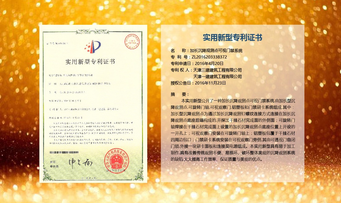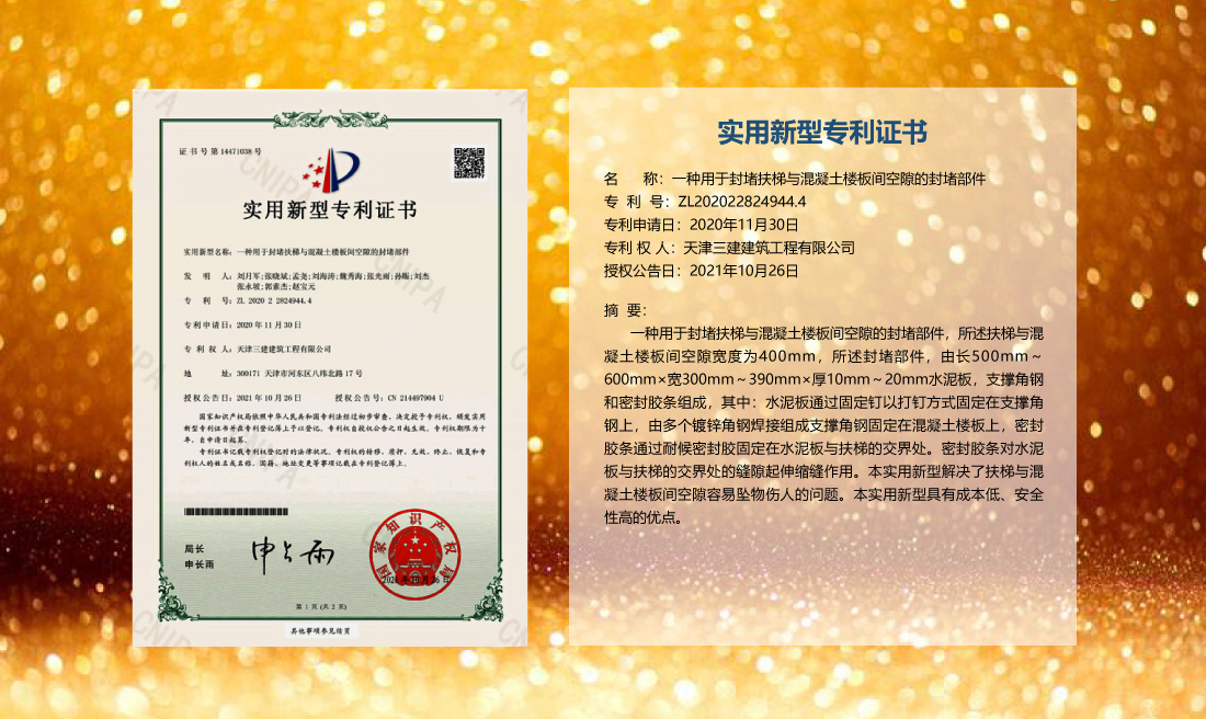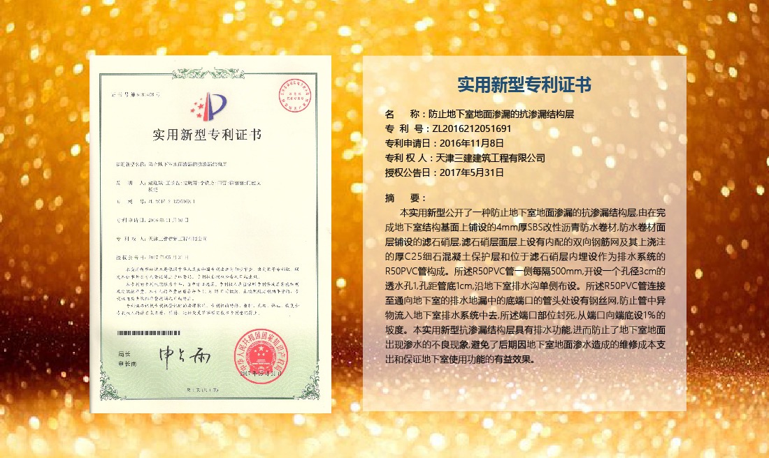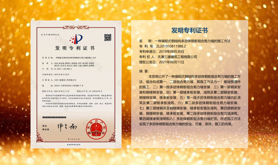 三建公司在總結施工經驗的基礎上,不斷發明創新,共獲得國家知識產權局授權專利71項,其中,國家發明專利12項,國家實用新型專利59項。囊括建筑、市政、巖土、道橋等多領域,凝聚了公司廣大工作人員的寶貴智慧和工程建筑者們的辛勤汗水。